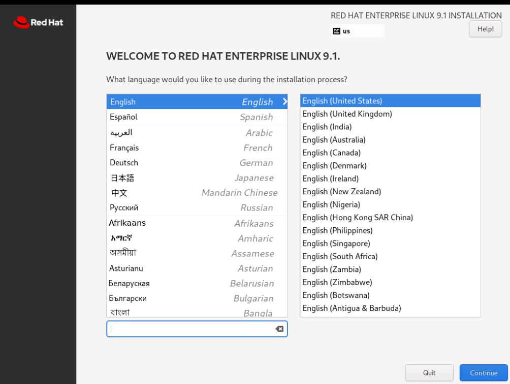 - Once the Red Hat installer GUI starts, select your language localization settings, and click Continue.