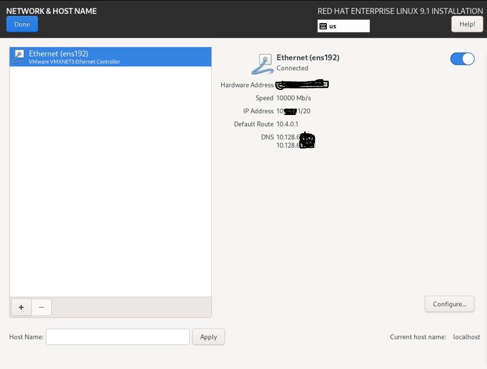 The VM retrieves an IP address and DNS settings using DHCP (IPs and MAC redacted for security reasons). - In the upper-left corner, click Done.