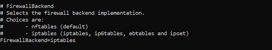 CODEsudo vi /etc/firewalld/firewalld.confIn the firewalls.conf config file, change FirewallBackend=nftables to: