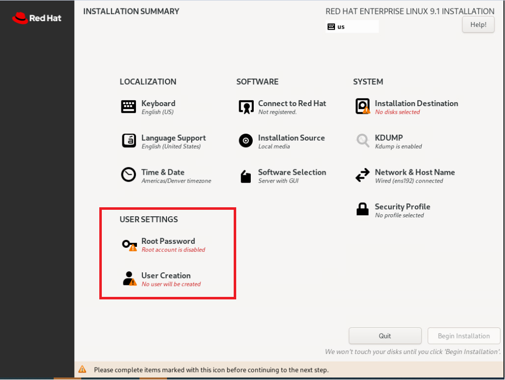 The Installation Summary screen appears. - To set a root password, under the User Settings section, click Root Password.