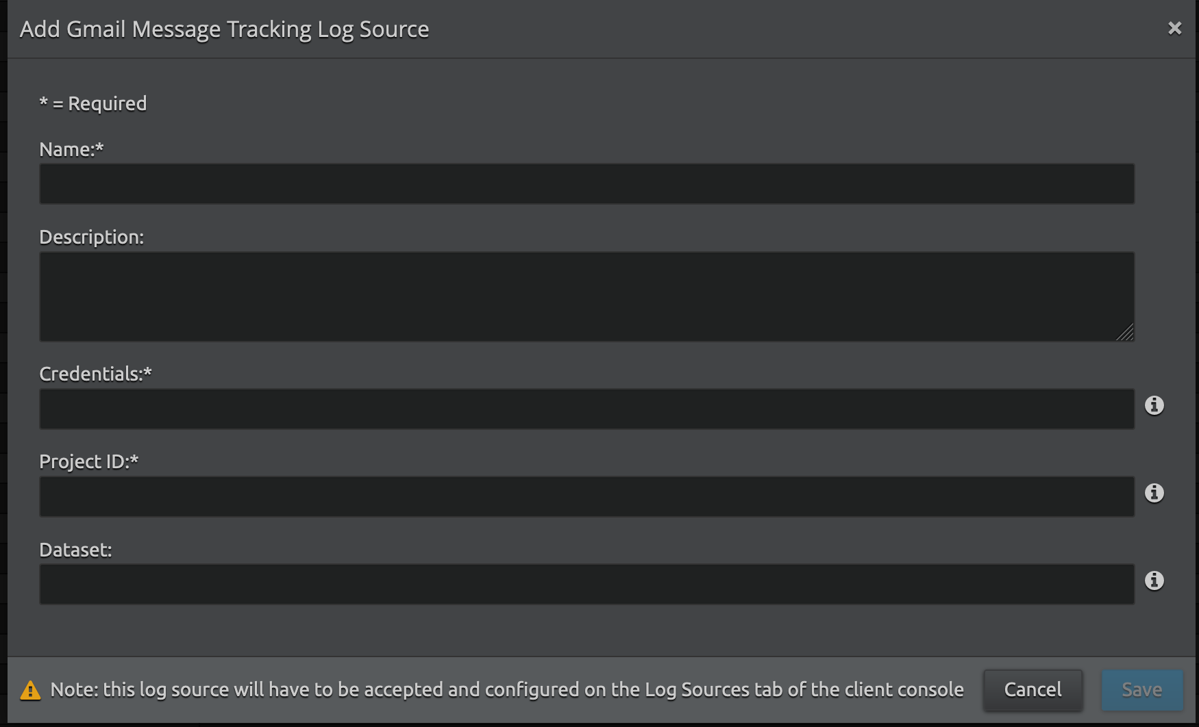 Name Enter the name for this log source. Description (Optional) Enter a description for this log source. Credentials Download the .JSON credentials file from the project and then copy and paste the contents of the .JSON credentials into this field.