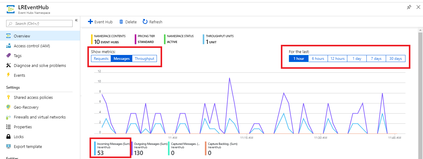 - If the Incoming Messages is 0, no logs have been configured from Azure Monitor to send to this Event Hub.