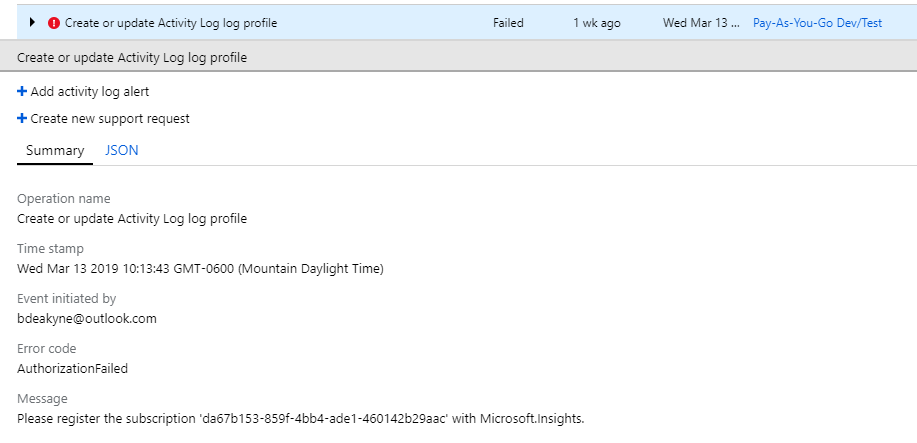 - If configuring diagnostics generates errors in the Portal, the Activity Log in Azure Monitor often gives a short description of the error. To export the Activity Log to an Event Hub, Azure requires you have a Microsoft Insights Application set up. In Azure Monitor, find the Insights → Applications tag, then add a new Application of Type General.