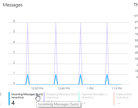 - In the Messages metrics graph, you should see Incoming Messages, which indicate that logs are getting into the Event Hub.