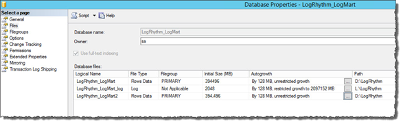You must determine the Database Name, Logical Name, and Current Path for each LogRhythm database log file on the system. In the following example, the log file for LogRhythm_LogMart will be moved.