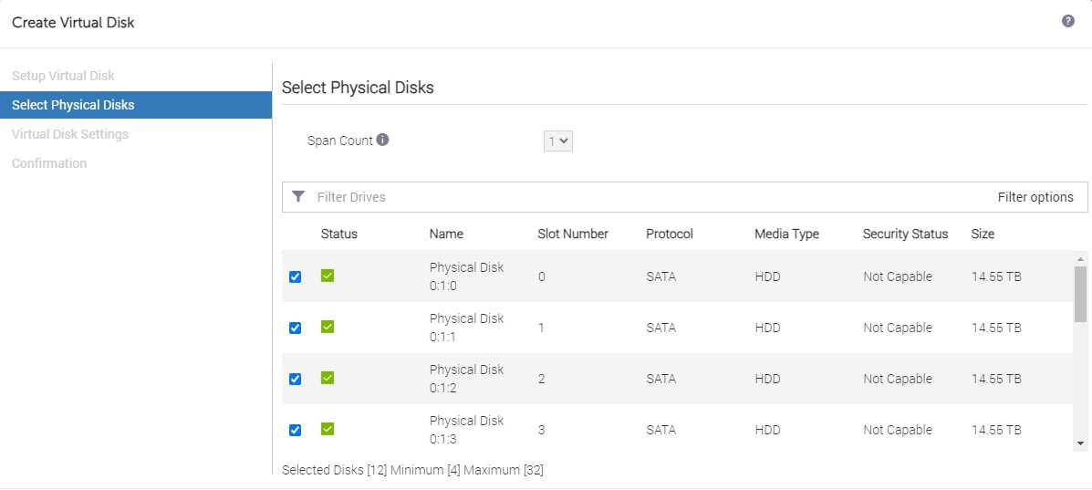 - Select all 12 the physical disks numbered 0 - 11 by checking the boxes on the left of each disk, you will need to scroll to the bottom to select them all, then click "Next", review the settings on the next page, then "Next" again.