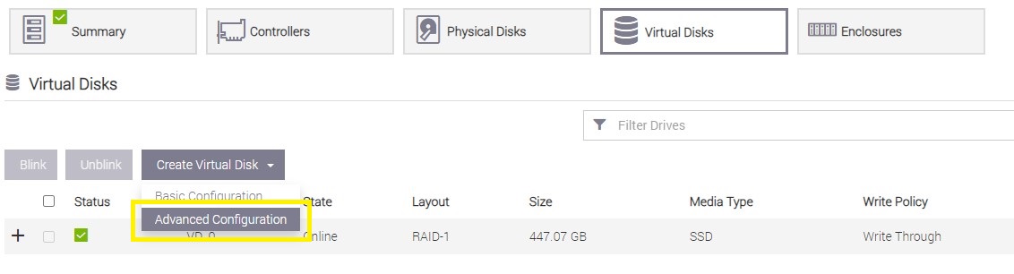 - Select the "Create Virtual Disk", button then select "Advanced Configuration"