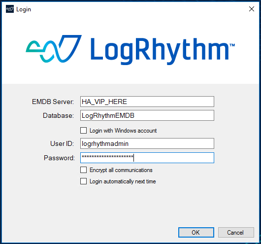 - After all services are configured, open the LogRhythm Console. Log on using the Shared Name or IP.