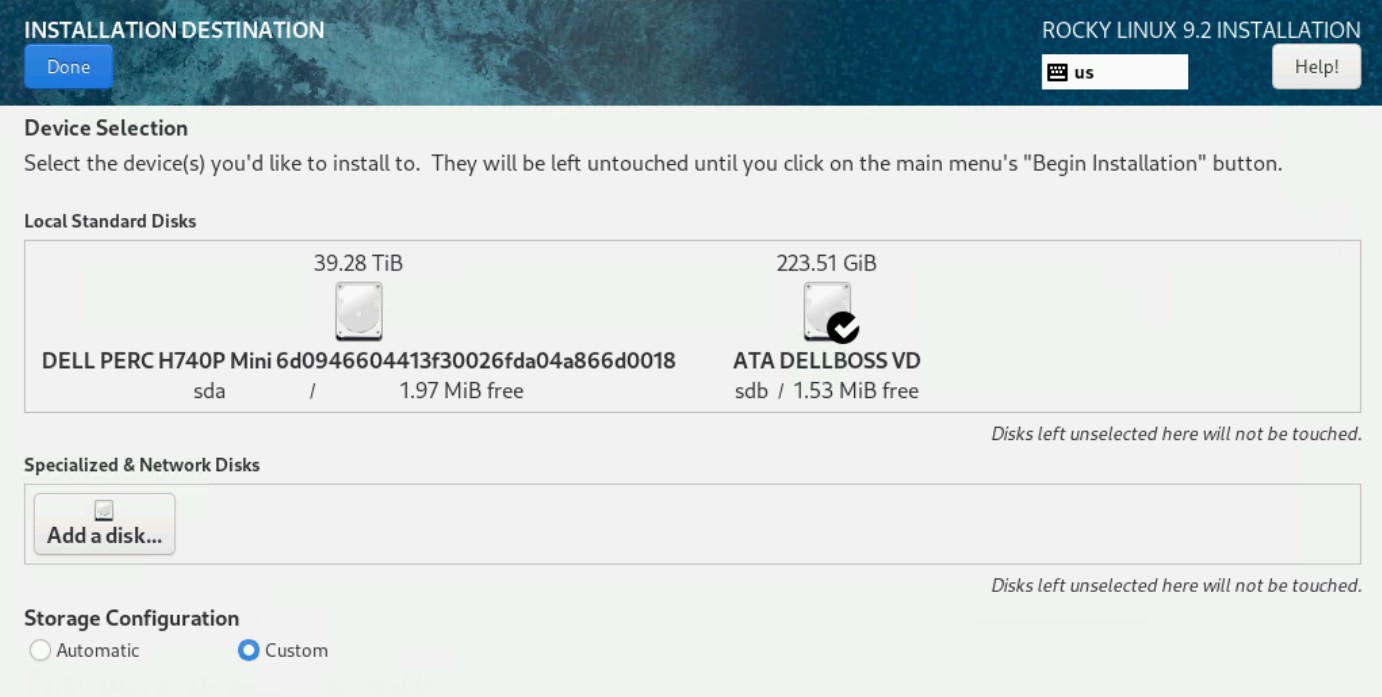 Click on the smaller disk to highlight it, then choose Custom under Storage Configuration.