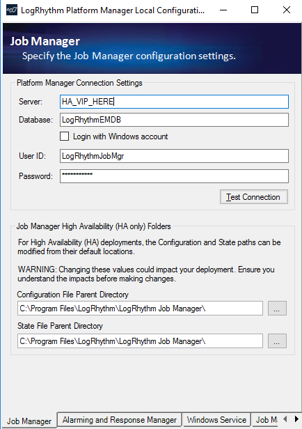 On an XM, update all below on both systems in the HA pair. The Server field for each should contain the IP/VIP of the HA pair.Platform Manager - Open the Platform Manager Configuration Manager and update both the Job Manager and Alarming and Response Manager tabs.