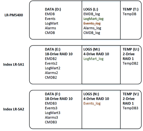 When a second LR-SA is added to the PM5400, additional data files are created for each database on the F: drive, and also for TempDB on the V: drive. The Events log file is moved from the L: drive to the N: drive.