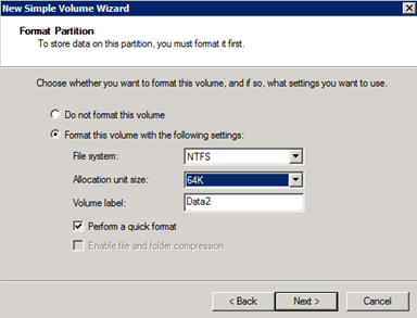 5. Set the Allocation unit size to 64K, provide a descriptive name (Volume label), and then select the Perform a quick format check box.