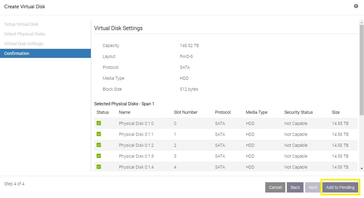 - Select all 12 the physical disks numbered 0 - 11 by checking the boxes on the left of each disk, you will need to scroll to the bottom to select them all, then click "Next", review the settings on the next page, then "Next" again.