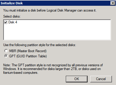- Initialize the disk as GPT, and then click OK.