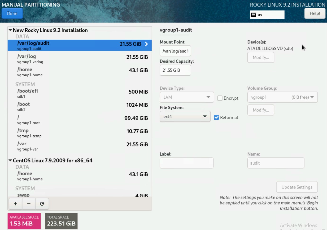 Ensure that the Reformat box is checked.Clicking Reformat allows Rocky Linux 9/RHEL9 to be installed in the old OS's place.