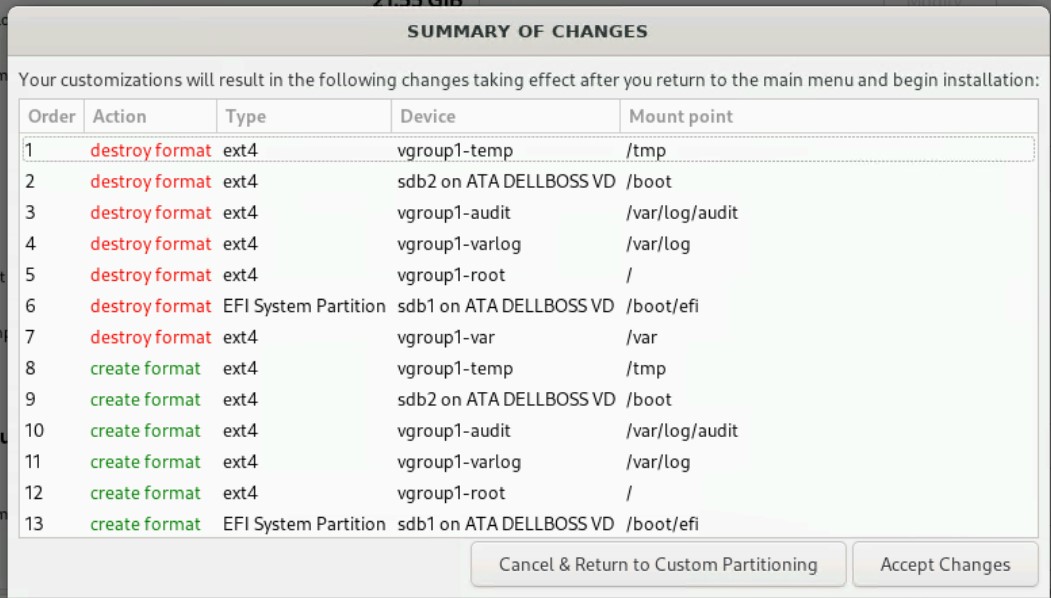 The existing volumes appear.Once you are done configuring your filesystems, you will be presented a summary of what the installer intends to do. Be sure to examine it carefully before continuing.