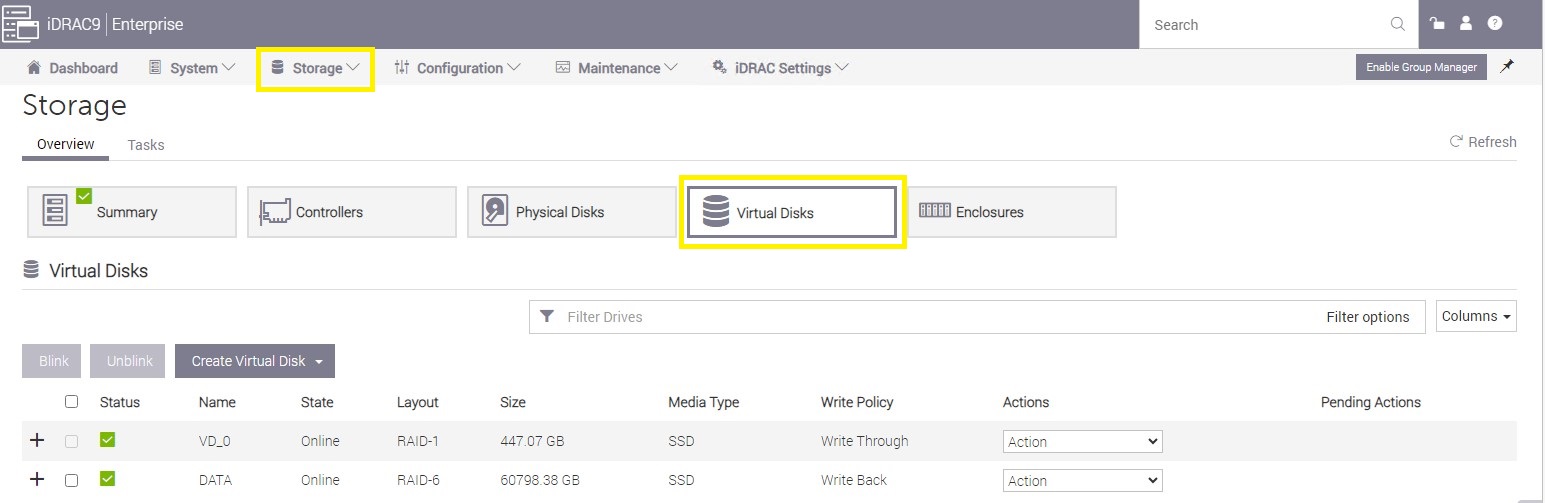 - To access the storage configuration select the "Storage" top level menu, then "Virtual Disks" to configure our Virtual Disk for the LogRhythm Storage Appliance (See YELLOW). Your existing Virtual Disk configuration will vary depending on which appliance you are installing the storage array on so the screenshots may vary
