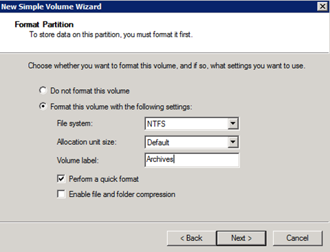 Choose a drive letter, provide a name, and then select the Perform a quick format check box.