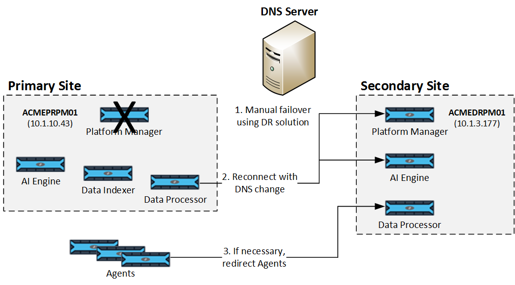 Update the common DNS record so the Primary site components point to the IP address of the Secondary Platform Manager. Once the time to live (TTL) limit is reached, all systems within the Primary site reconnect to the newly activated Platform Manager.