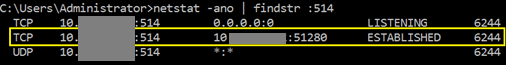 CODEnetstat -ano | findstr :514The connection status should change from LISTENING to ESTABLISHED as shown in the example output below:
