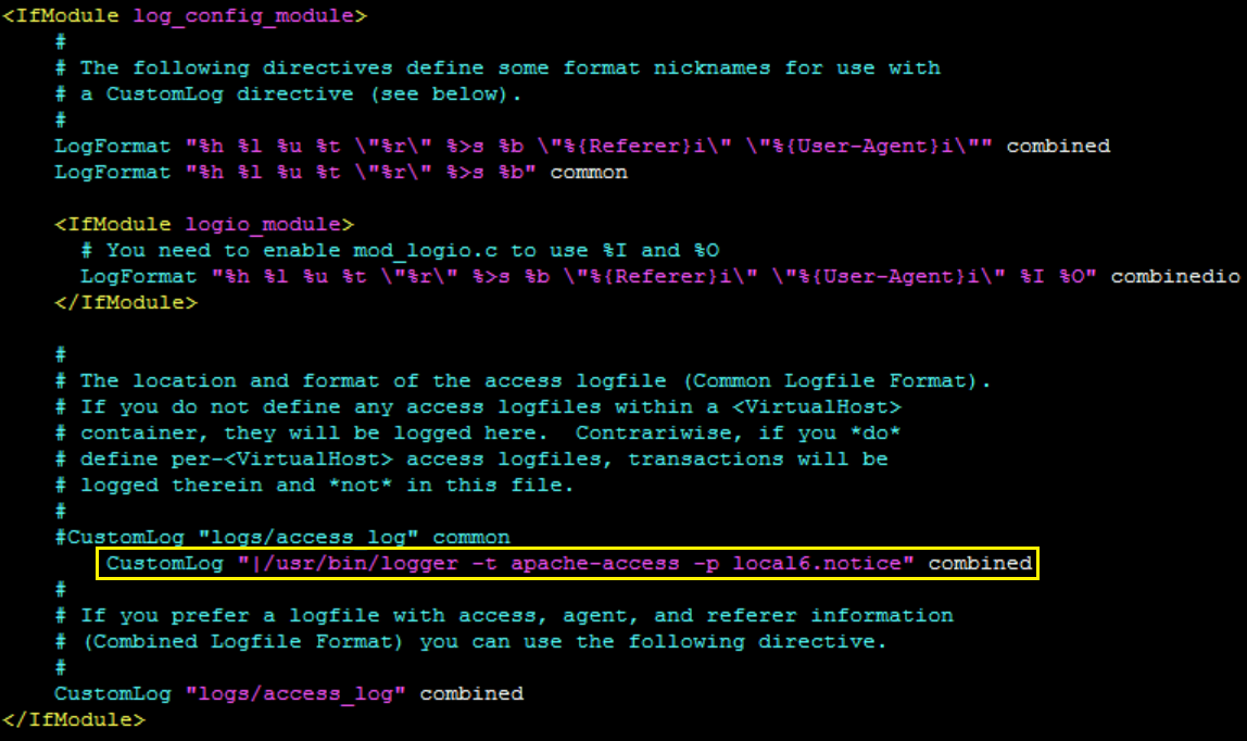 CustomLog "|/usr/bin/logger -t apache-access -p local6.notice" combined- CustomLog. The Apache access log command.