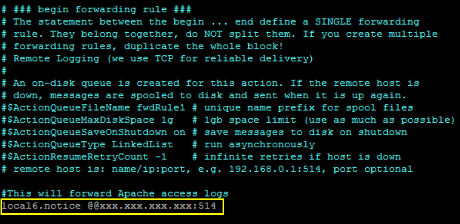 local6.notice @@xxx.xxx.xxx.xxx:514- xxx.xxx.xxx.xxx. The IP address of the LogRhythm Collector or System Monitor Agent that will receive the syslog stream.