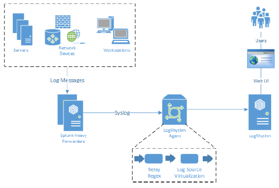 The Splunk to LogRhythm data feed is handled over syslog. Splunk Enterprise Servers can be configured as “Heavy Forwarders” to forward RFC 5424 compliant syslog to LogRhythm System Monitor Agents. All logs received by Splunk are redistributed over syslog to a receiver, which is the LogRhythm System Monitor. The format of the raw logs received depends on whether the original log source is a syslog or a non-syslog source.