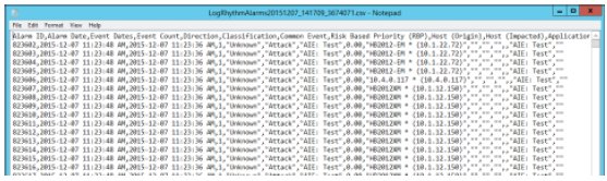- Open LogRhythymAlarmsxxxxxxxx_xxxxxxx.csv with a text editor.