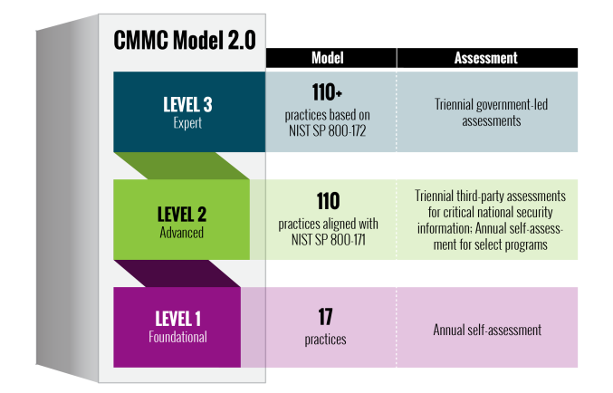 Organizations seeking compliance and certification with the CMMC will be looking at one of three levels that measure technical control capacity in a few different ways. The lowest level of the certification (Level 1) requires entities to adhere to a sub-set of the 110+ controls (as prescribed by the OUSD (A&S)). The certification model and levels are briefly summarized below.