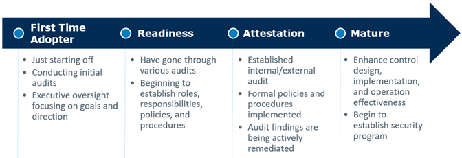 Audits and ongoing compliance programs might be viewed as compulsory, but organizations can actually leverage regulatory frameworks to create competitive advantages. As an organization progresses across the compliance maturity model (below), a security foundation emerges around policies, controls, systems, personnel, and understanding. The organization begins by developing key resources such as system and account classifications, risk assessments, scope definition, process and data flows, and audit results year-over-year. All these factors are ingredients to constructing a solid yet resilient compliance foundation that enables an organization to transition into a more mature security posture. This transition occurs as the organization builds its security program on a holistic and transparent understanding of its environment and risk profile.