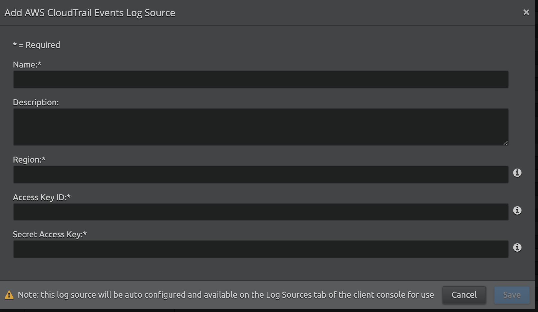 Select the AWS CloudTrail EventsSYSMON AGENT tile. The Add AWS CloudTrail Events Log Source window appears.