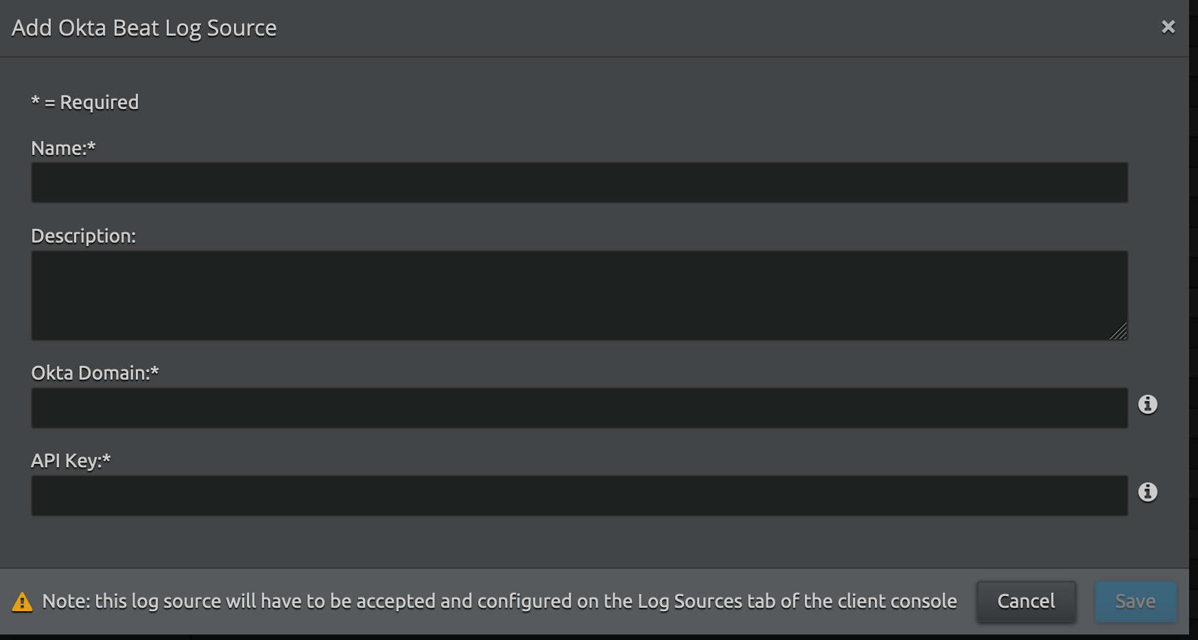 The Add Okta Beat Log Source window appears. Enter the following details: