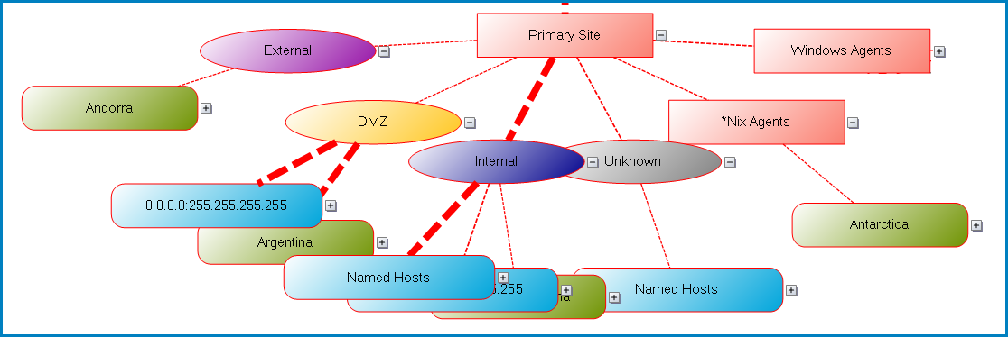 For example, in the following diagram where Link Display Mode is set to Logs: Primary Site, Total Log Count = 48,000 logs: Internal node, widest line, Total Log Count = 42,000 logs. Named Hosts, widest line, Total Log Count = 35,000 0.0.0.0:255.255.255.255, medium line, Total Log Count = 6,000 Wallis and Futuna (green field hidden at the bottom), narrowest line, Total Log Count = 1,000