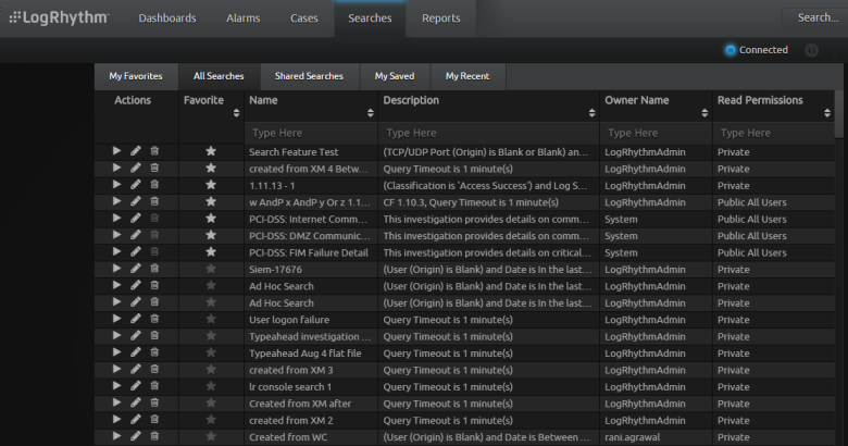 The Searches page provides access to your search history on the Web Console and your saved investigations on the Client Console. You can also access the investigations that others have saved and shared with you on the Client Console, including the investigations that have been packaged in the Knowledge Base Modules. You can run any of the searches/investigations that you find listed on the Searches page. Search management features allow you to edit or remove searches from the page as needed.