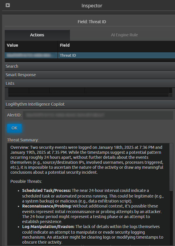 If the Threat ID field is unable to be parsed from New-Scale, the LogRhythm Intelligence Copilot section is not available within the Inspector Panel.