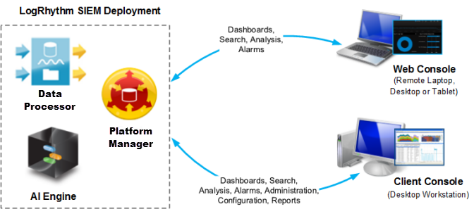 Administrators can use either the Web Console or the Client Console to access logs, events, and alarms generated from the LogRhythm SIEM deployment: