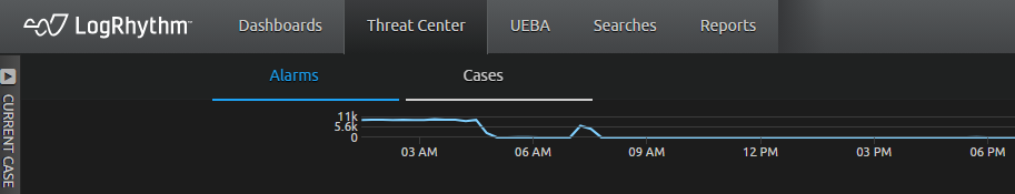 The navigation bar provides links to the Dashboards page, Threat Center (which contains links to the Alarms and Cases pages), Searches page, and Reports page.