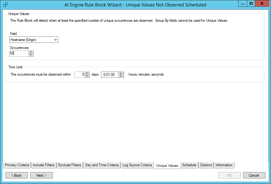 The Unique Values tab appears on all Unique Values AI Engine Rule blocks. It is used to detect when more than the number of unique occurrences you specify are observed.