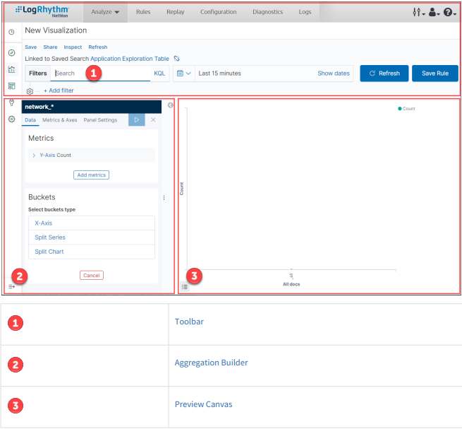 The preview canvas displays a preview of the visualization you’ve defined in the aggregation builder. To refresh the visualization preview, click the Refresh button on the toolbar.