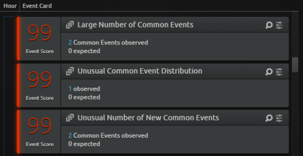 In the following example, the behavior score related to Common Events is predominantly made up of three different features: Large Number of, Unusual Distribution of, and Unusual Number of. Each of these features contributes a meaningful proportion of the ultimate behavior score.