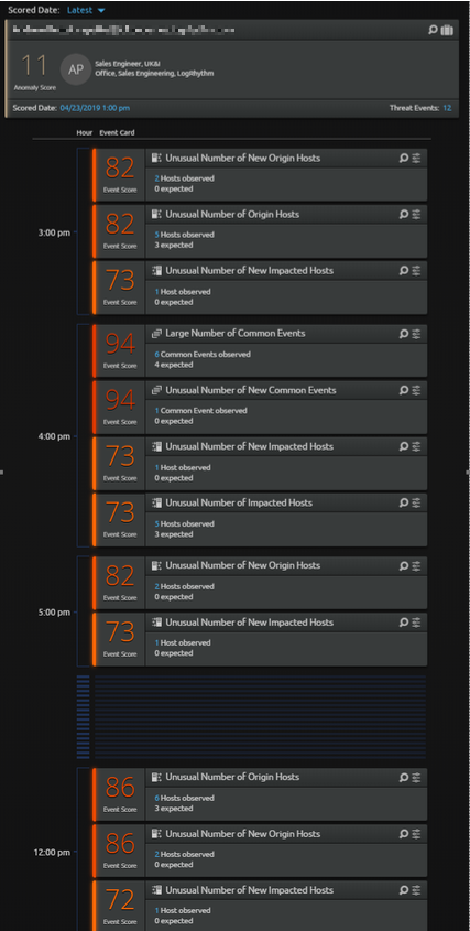 Behavior scores that do not reach a significant behavior and feature contribution threshold do not display in an Event Card, but they are still considered in the User Anomaly Score. For example, the following image shows a user with an overall User Anomaly Score of 11, but there are multiple high value Event Score cards. This occurs when there are many low-scoring behaviors which are included in the User Anomaly Score, but they are not high enough to warrant an Event Score card by themselves.